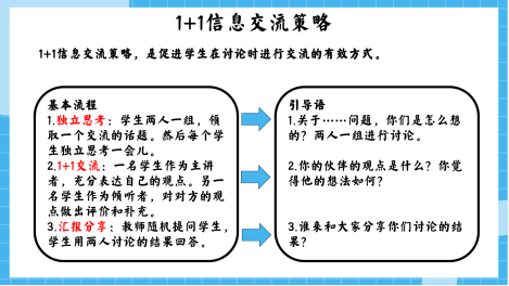 王老师着重介绍了多项特色策略。例如,“1+1信息交流策略”借助“独立思考—1+1交流—汇报分享”这三个步骤,引导学生在倾听与表达过程中达成观点融合;“编号齐动脑策略”采用随机编号汇报机制,保证每位学生自始至终都参与到小组探究中,防止出现“边缘化”情况;“循环分享策略”通过有序发言与即时反馈,培育学生的批判性思维与逻辑表达能力。此外,“接力‘写’策略”为性格内向的学生提供安全的表达空间,“三折页策略”助力学生构建结构化思维框架。这些策略既有对经典方法的改编,也有基于实践的原创设计。