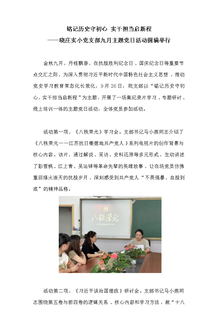 铭记历史守初心 实干担当启新程——晓庄实小党支部九月主题党日活动圆满举行
